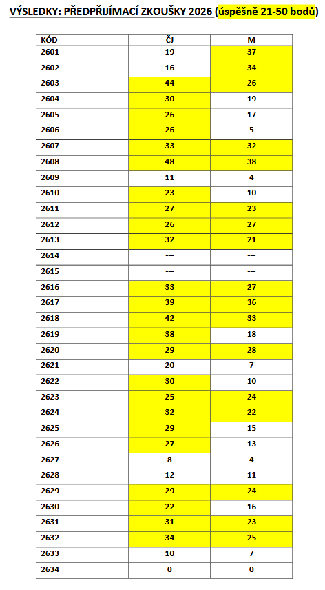 Výsledky předpřijímacích zkoušek 2026