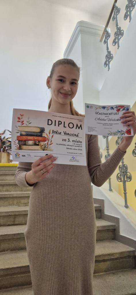 Naši školu reprezentovala žákyně 7. A Adéla Vorlická, která svým přednesem zaujala nejen porotu, ale i přítomné diváky. V konkurenci talentovaných recitátorů z celého okresu si vybojovala skvělé 3. místo.